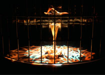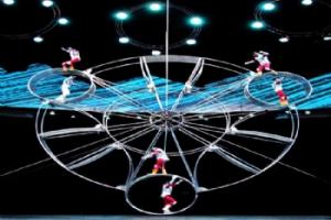 “碧波轻舟”。水幕将整个舞台变成了一泓湖水,水幕中出现了飘飘忽忽的一个光体,由远至近,由小变大,那是中国古代文明的象征